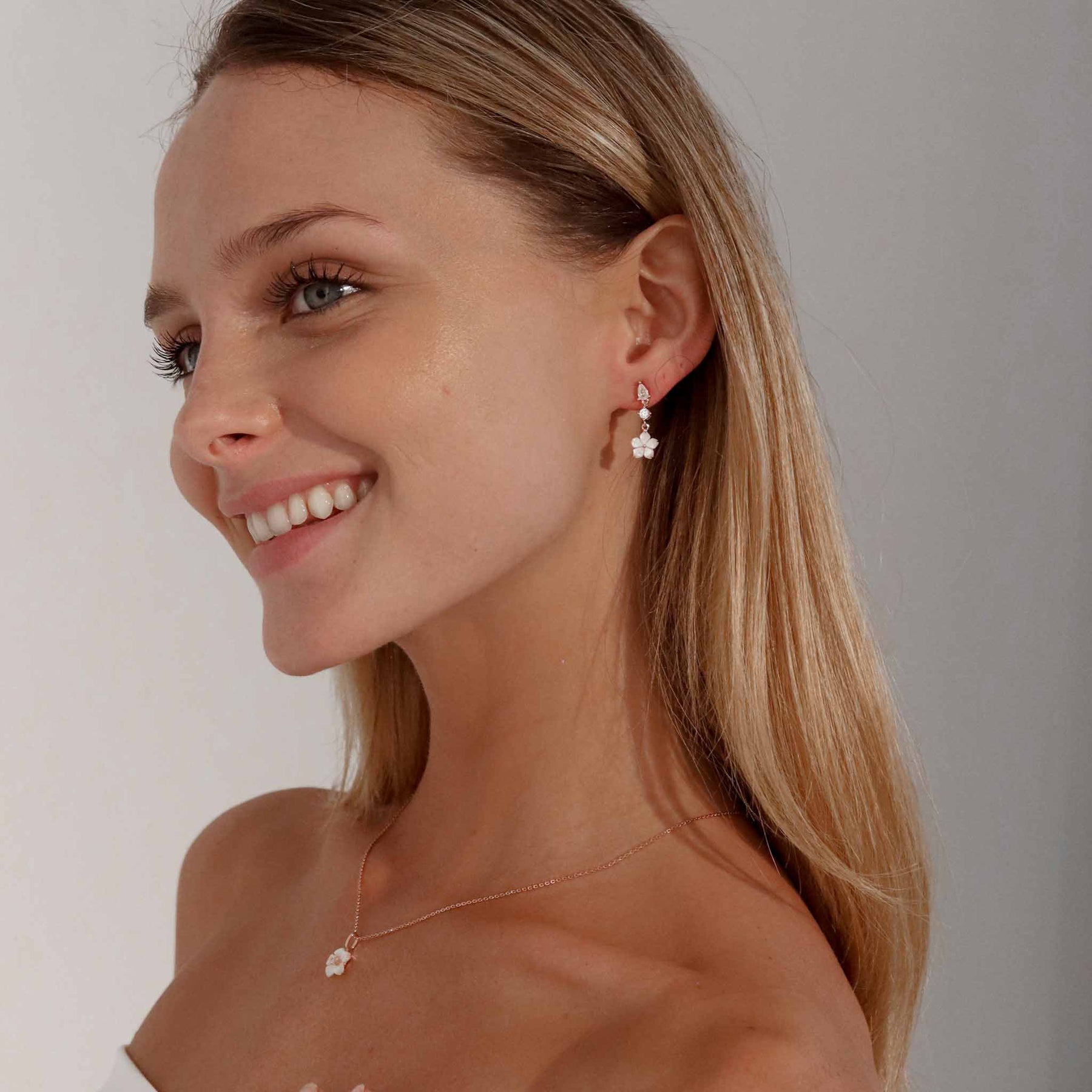 - Material: Roségold vergoldetes Kupfer, Zirkonia Kristalle (Diamantimitation), echte Perlmuttblume
