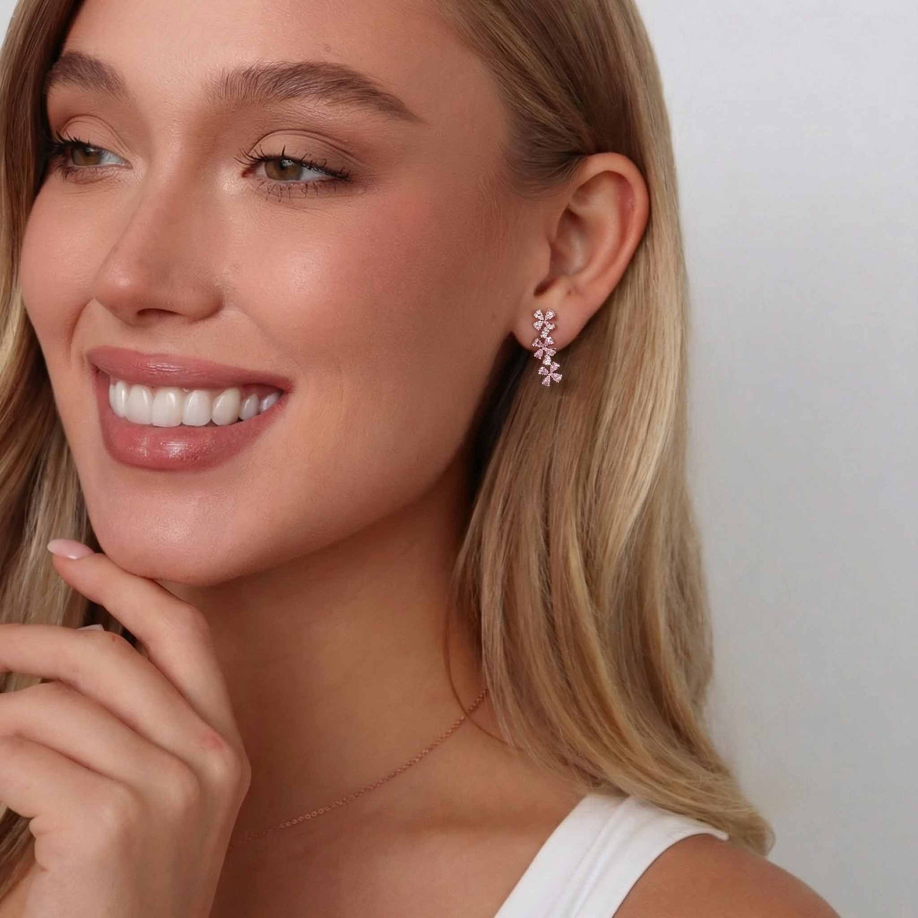 - Material: Roségold vergoldetes Kupfer, Zirkonia Kristalle (Diamantimitation), Perlmutt-Blume