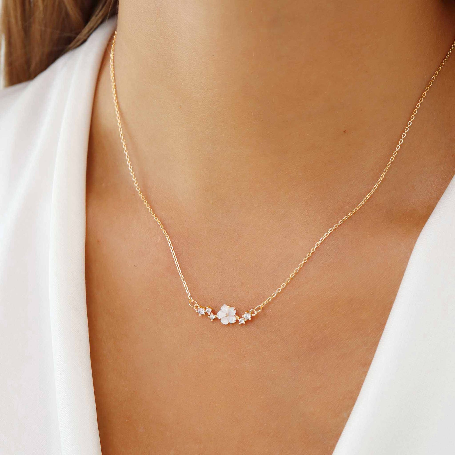 - Material: Echtgold-Plattierung 14k Gold auf Kupfer (Ohrringe, Armband) und vergoldetes Sterlingsilber (Kette), Zirkonia Kristalle (Diamantimitation), Perlmutt-Blume (kann vom Bild abweichen)
